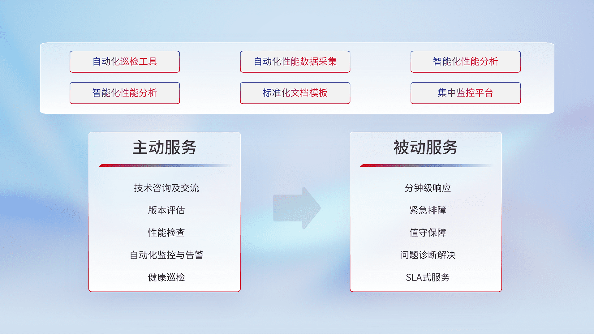 智能化工具和标准化文档,,保障服务质量,,提供主动服务(包含技术咨询、、版本评估、、性能检查、、自动化监控与告警、、、、健康巡检)和被动服务包含(分钟级响应、、、、紧急排障、、、值守保障、、、、问题诊断解决、、SLA服务)。。