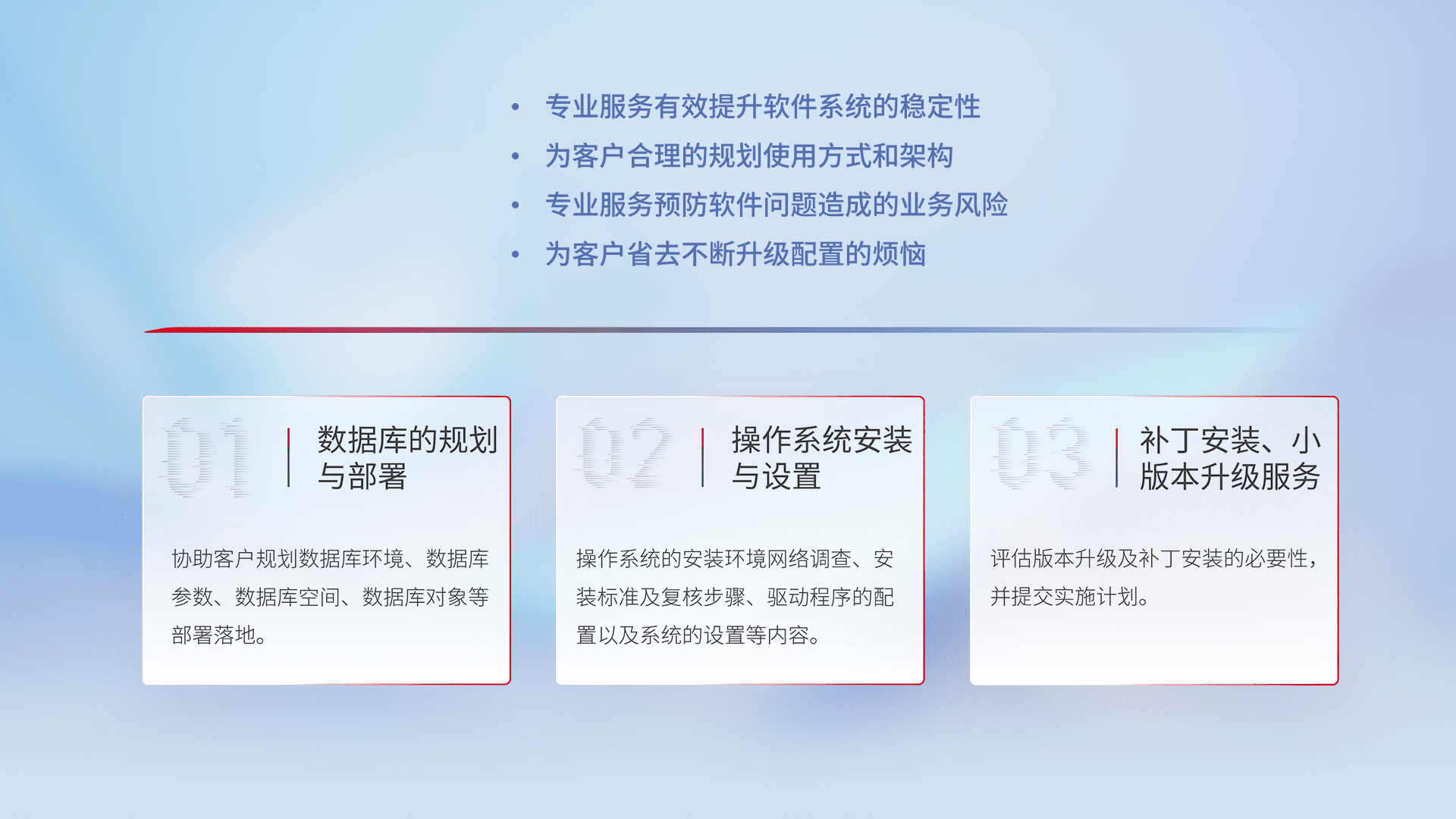 为客户提供软件规模升级、、、快速部署、、、按需配置的专业服务,,,从数据库的规划与部署到操作系统的安装与设置,,,再到补丁安装和小版本升级提供支持。。。
